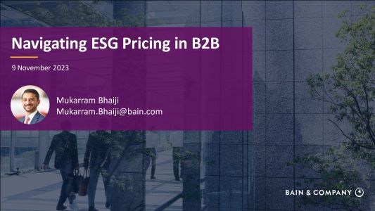 - ESG is re-shaping commercial value - disrupting whole industries and changing value proposition for individual products and offerings. Having a clear view on ESG value attributes and a thoughtful approach for how to price for them creates a significant advantage that enhances value capture and enables business longevity